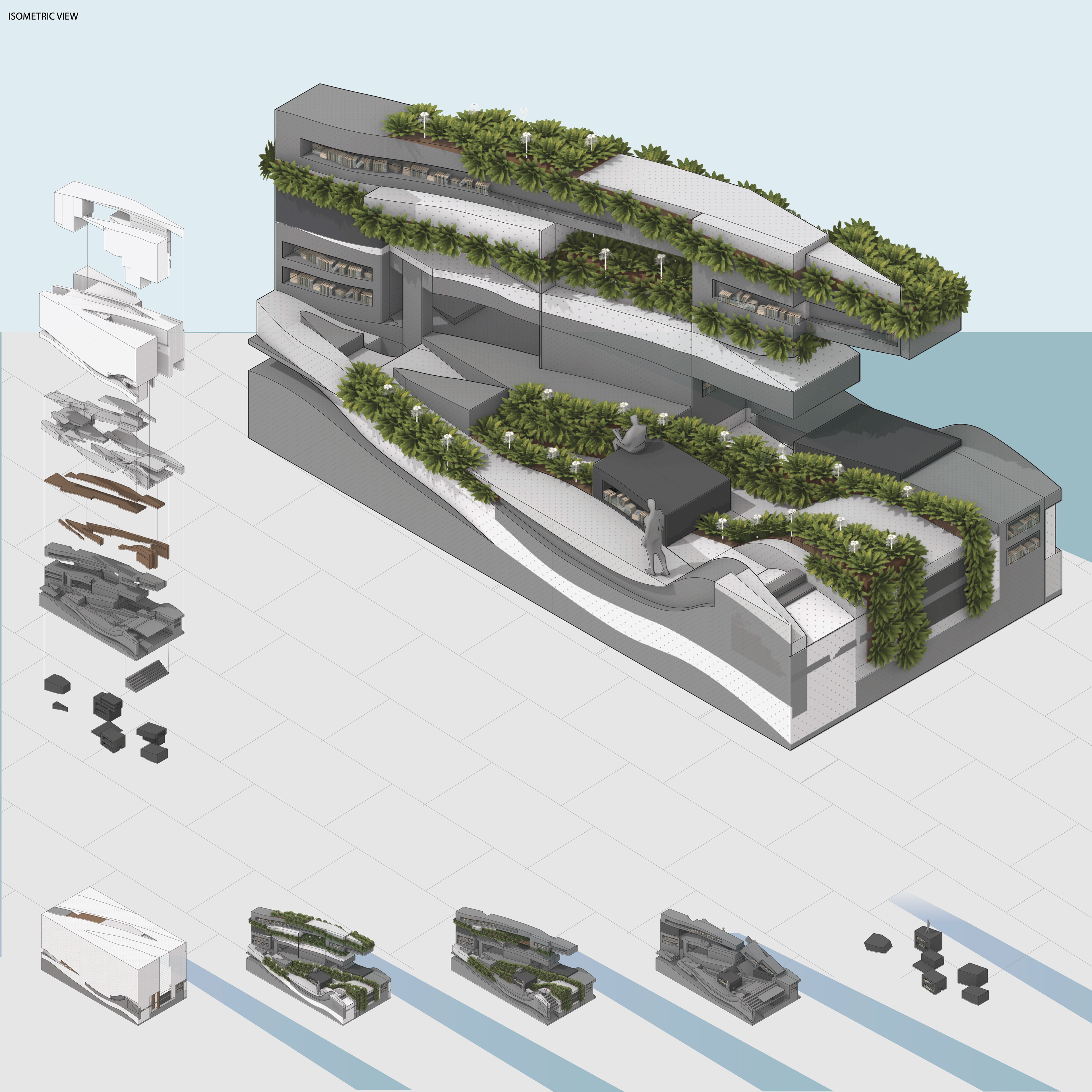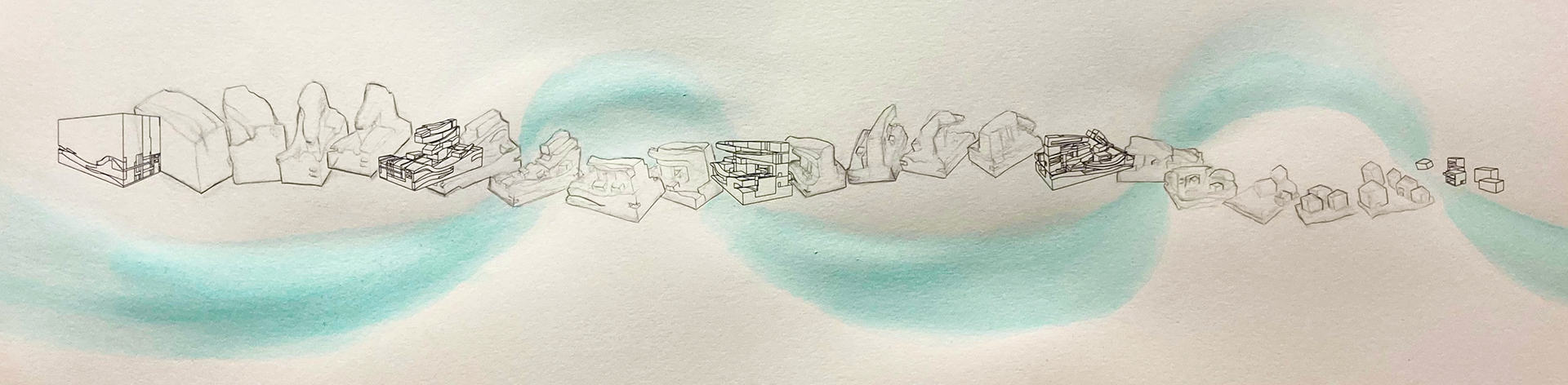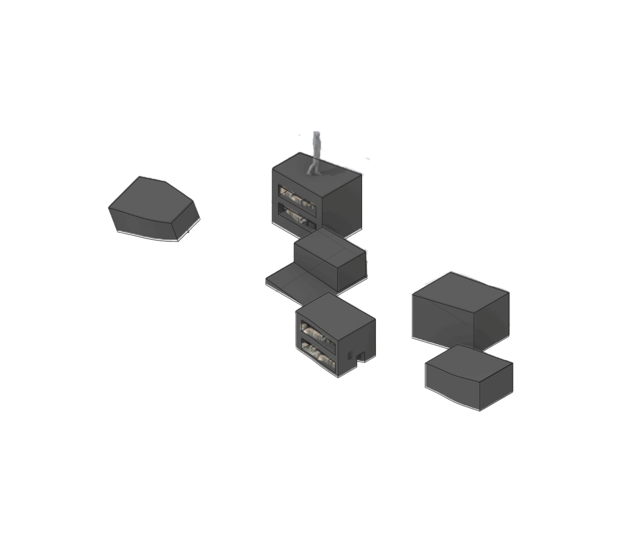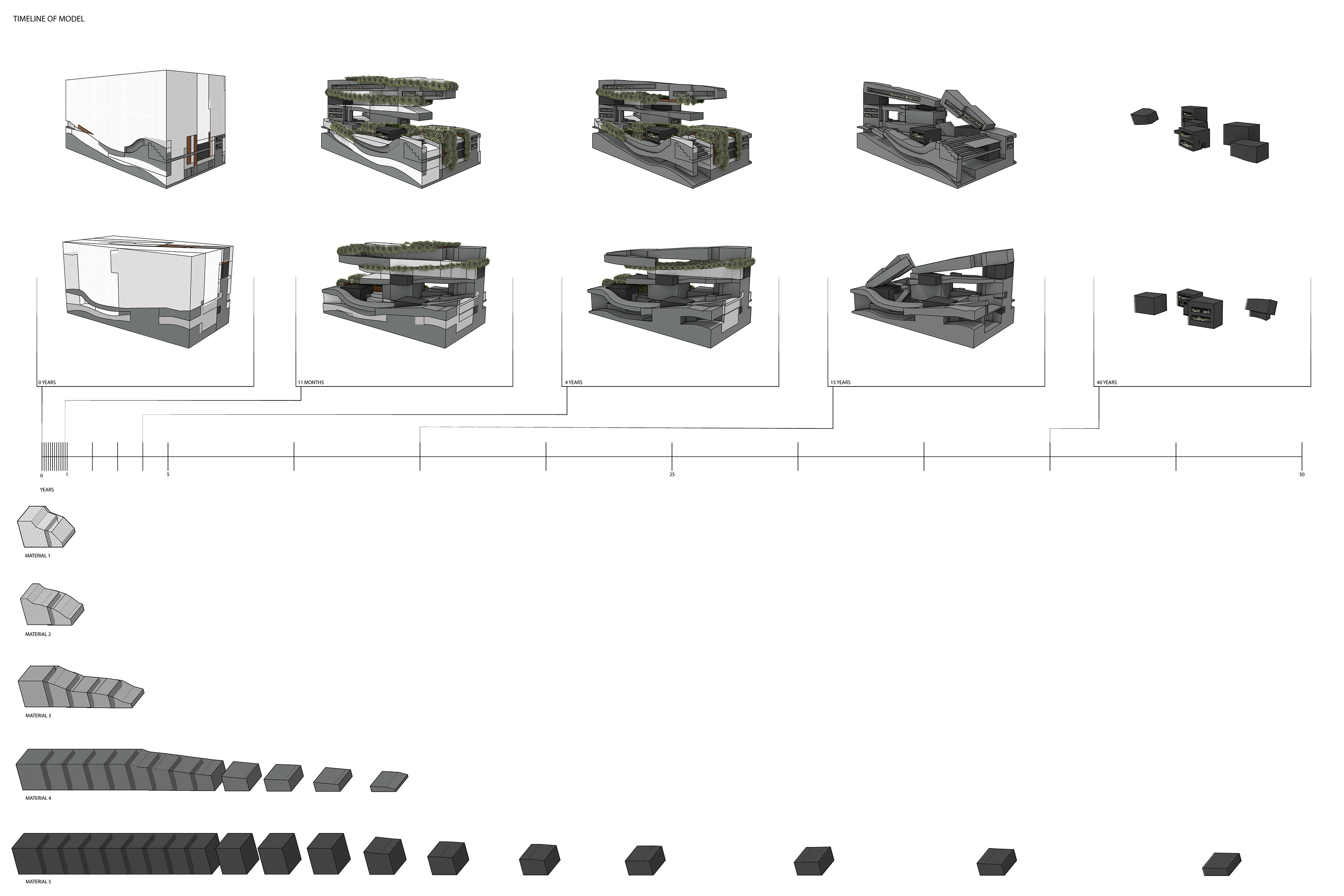 A prefabricated block of natural materials is placed along the canal edge. As time passes the materials dissolve in varying rates, revealing new environments to interact and inhabit. The five material types have varying levels of durability, and one embedded material is fertilized dirt with pre-planted seeds that will then grow into a garden as the dirt layer is revealed and the encompassing layers are dissolved.