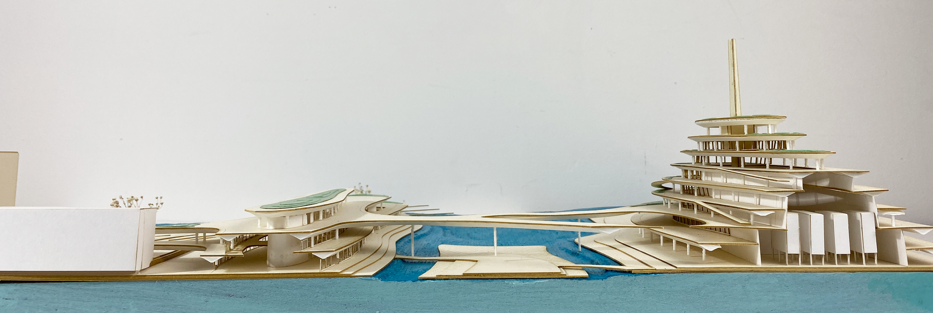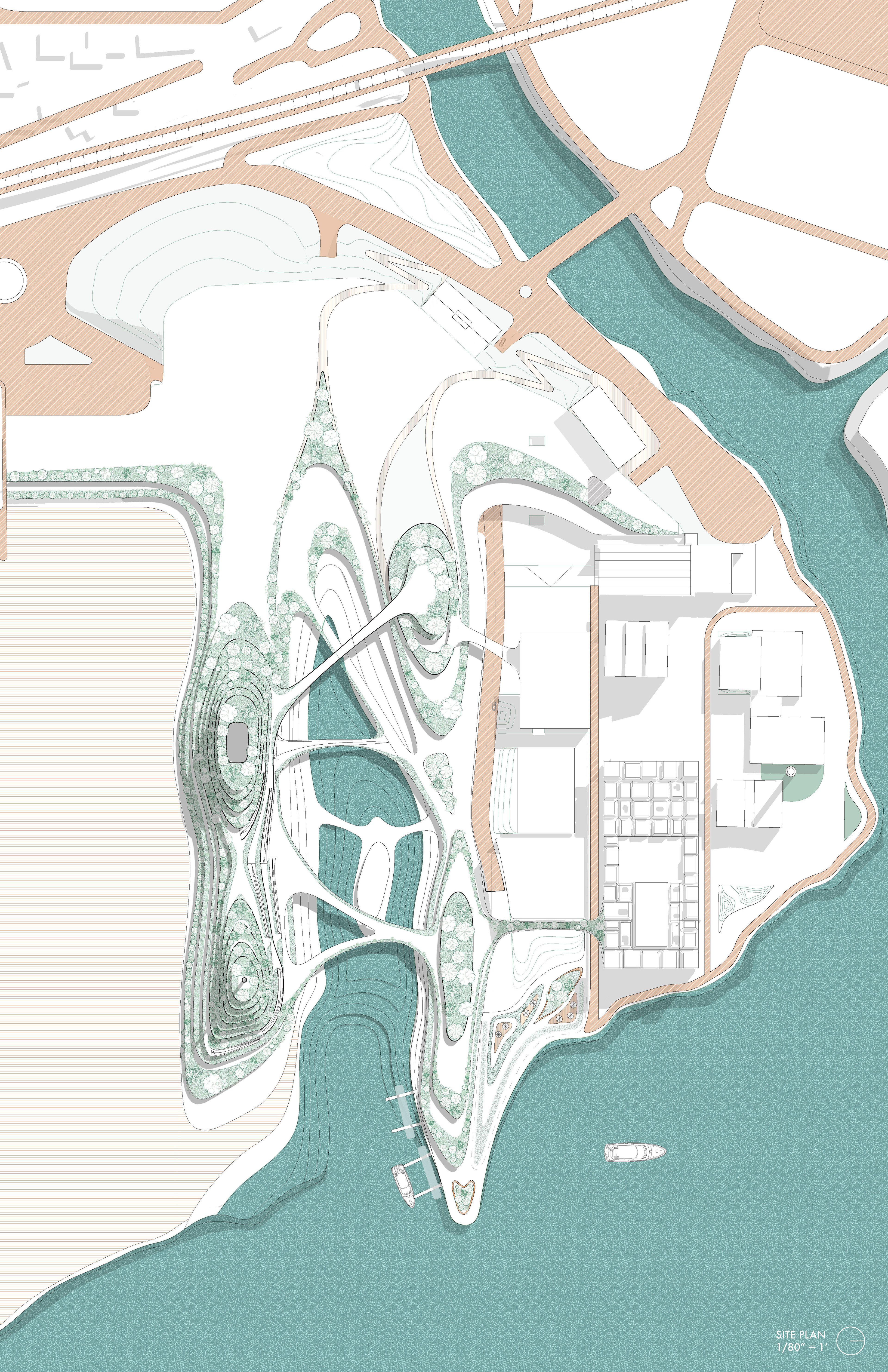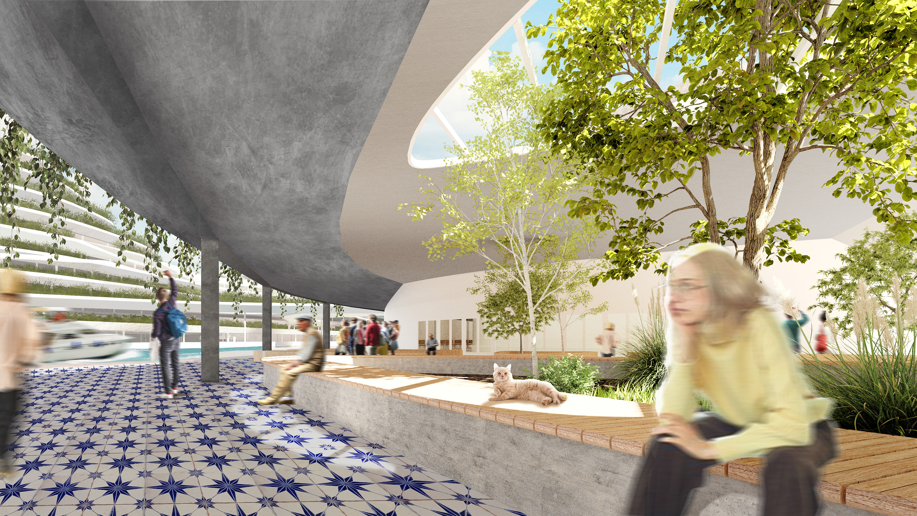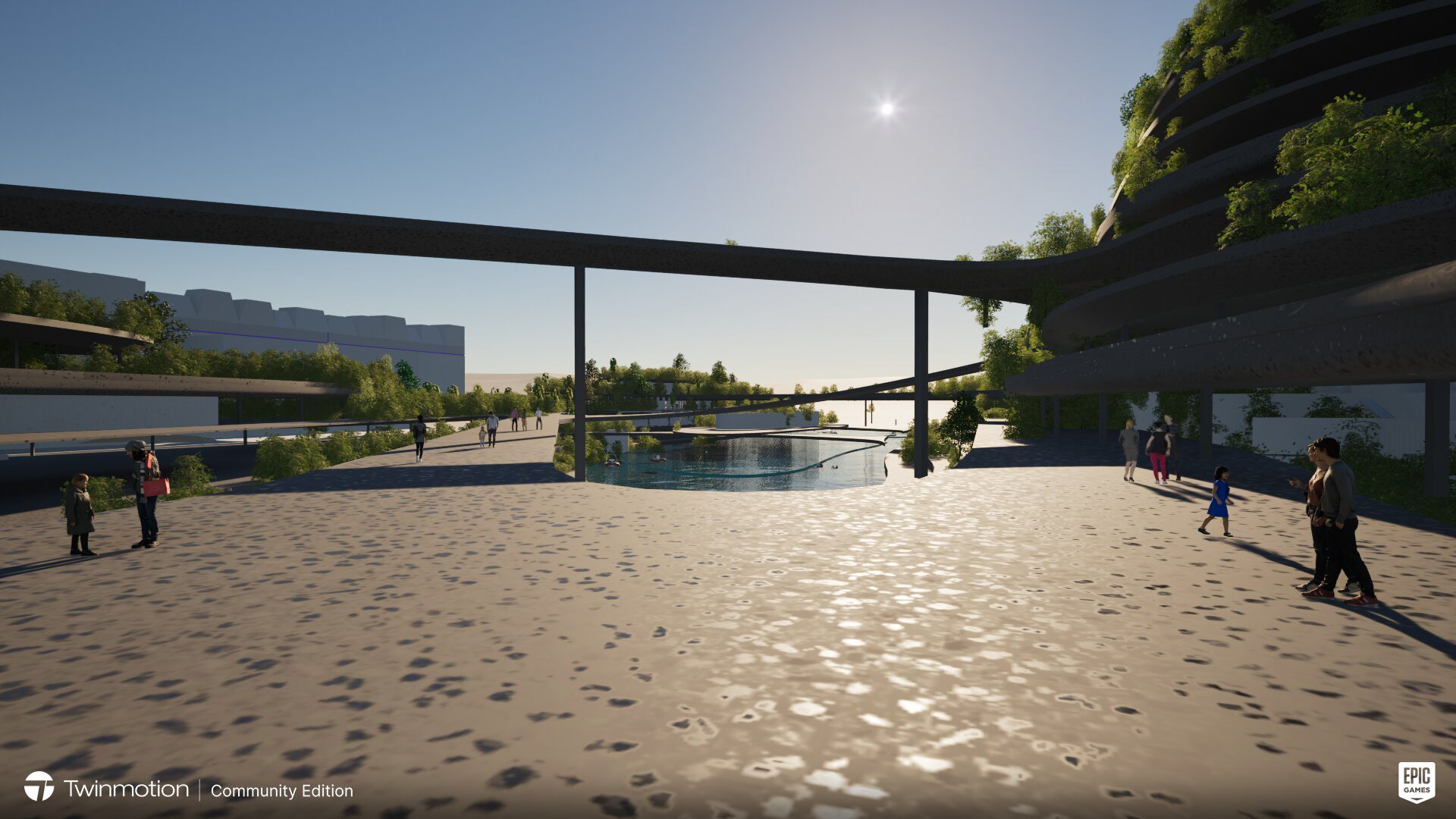 Park goers can traverse along, up, down and across the park with various pathways of ramps, stairs, and bridges. The bridges connect the two arms of the park across the interior boat docs where locals can boat in and visit the park, as it is customary for the riverside city occupants to own boats for transportation and leisure.