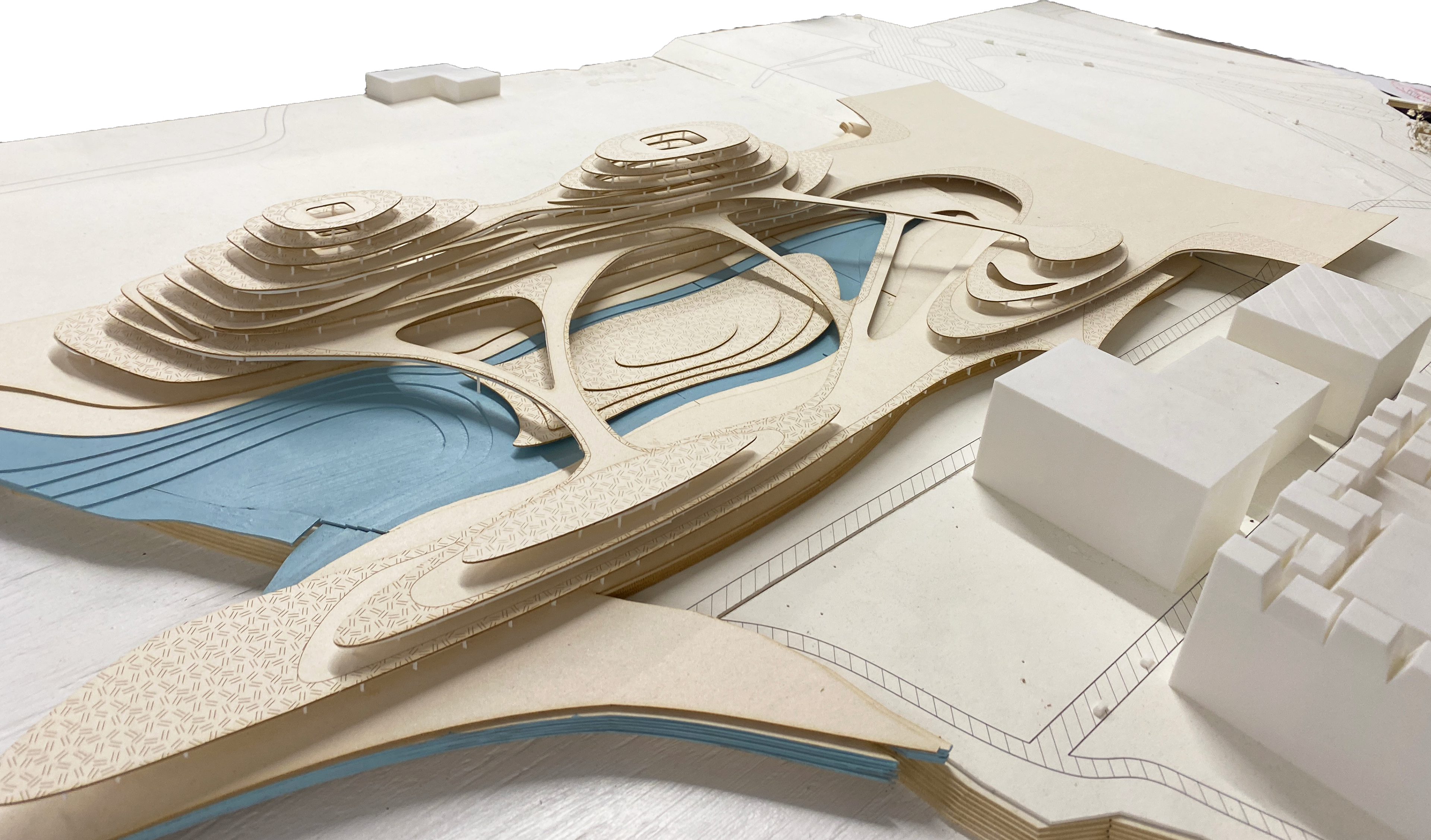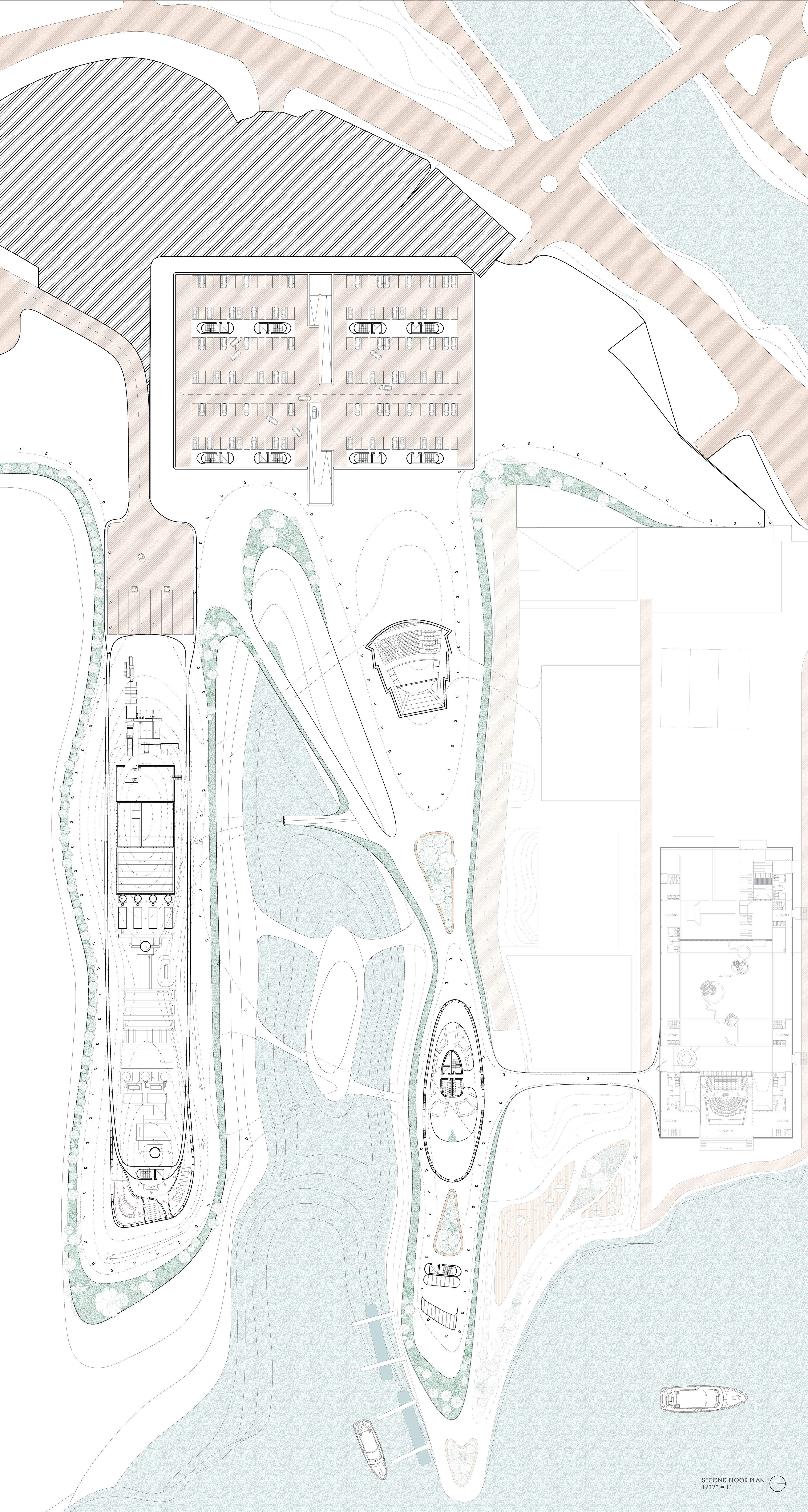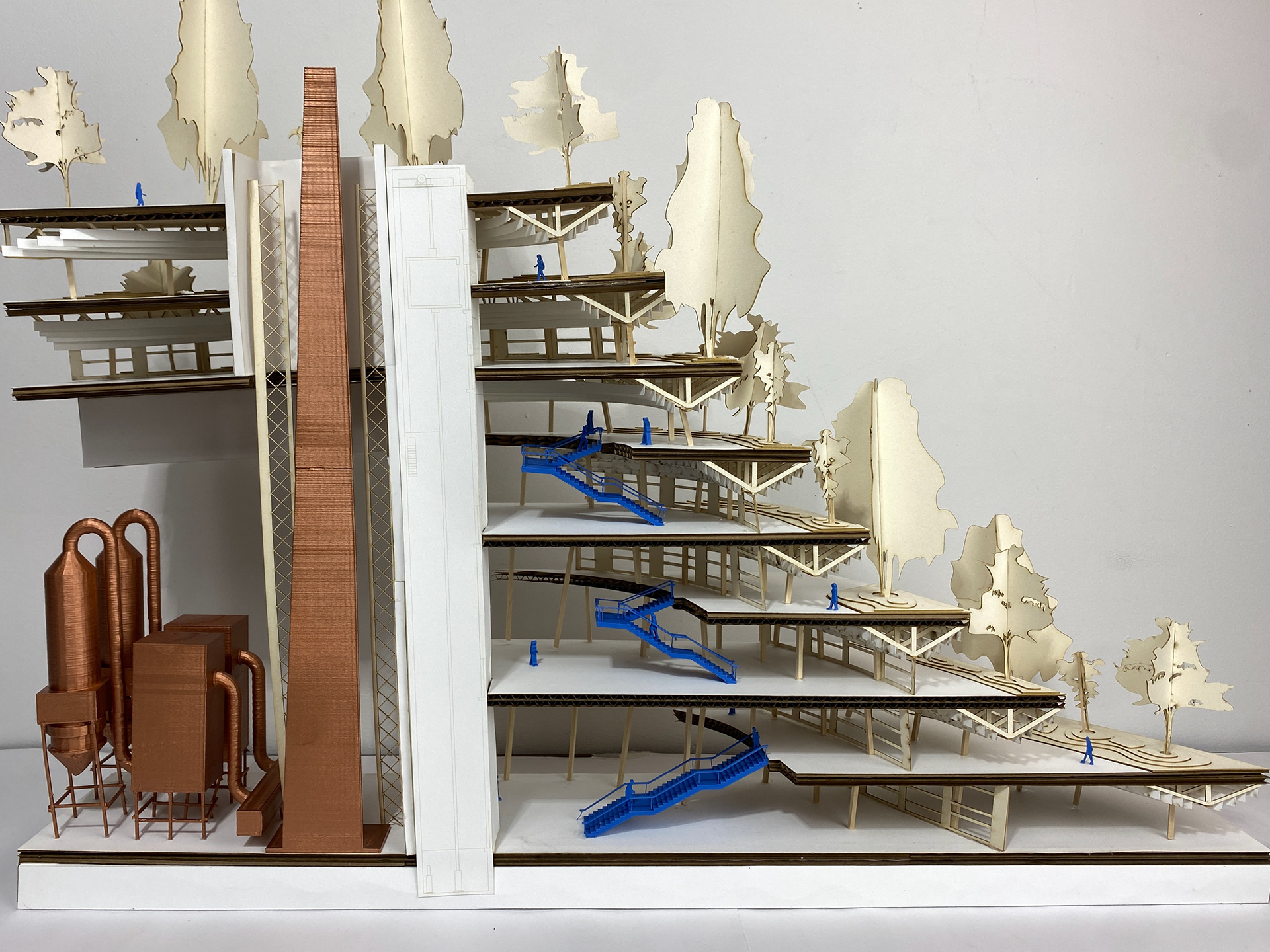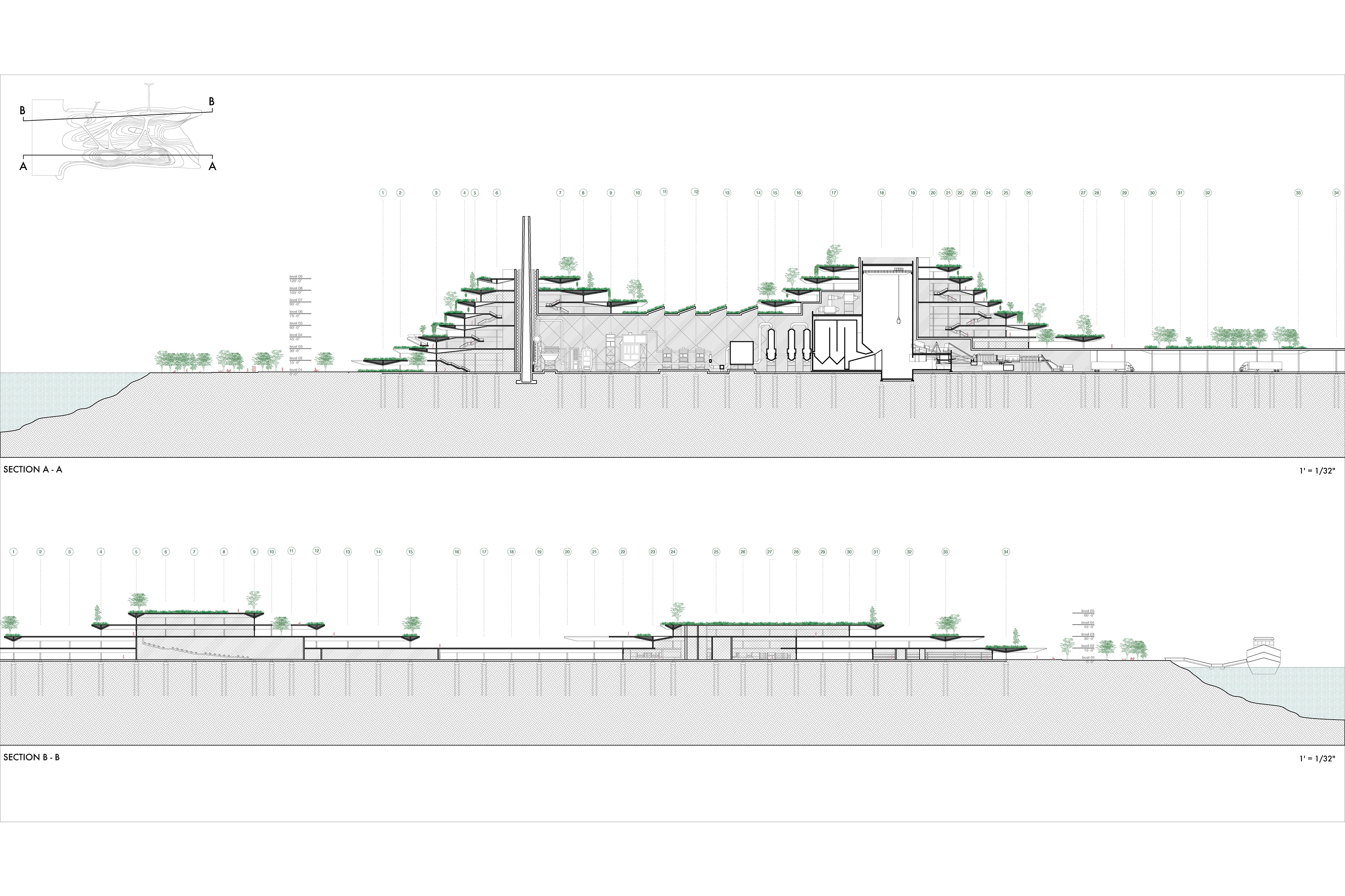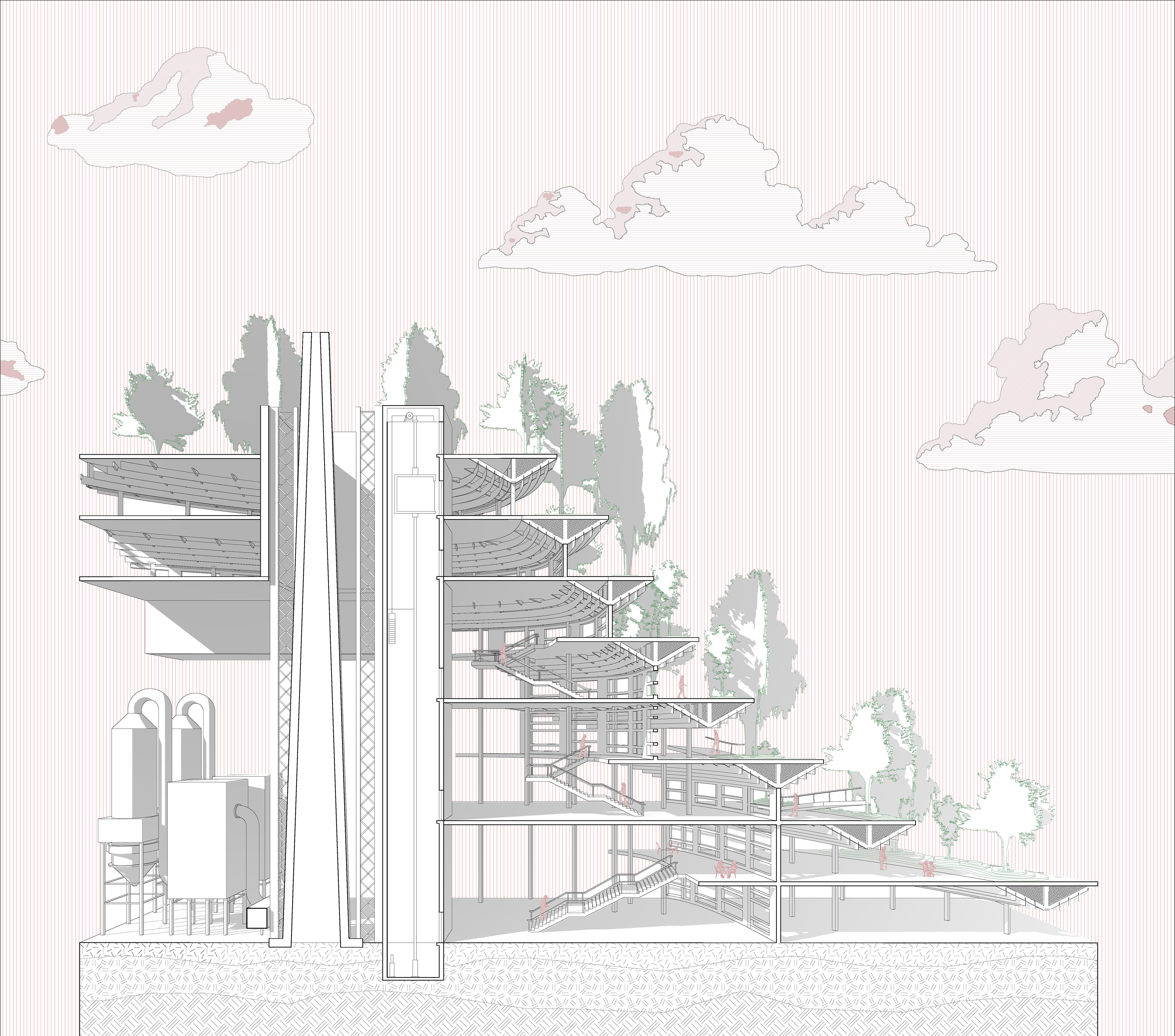 The waste to energy plant provides clean energy to the city of Rosario. The surrounding park is created with topographical layers from a mountainous encompassing structure, with the deeper interior areas of the platforms transformed into learning and working centers with double height spaces.