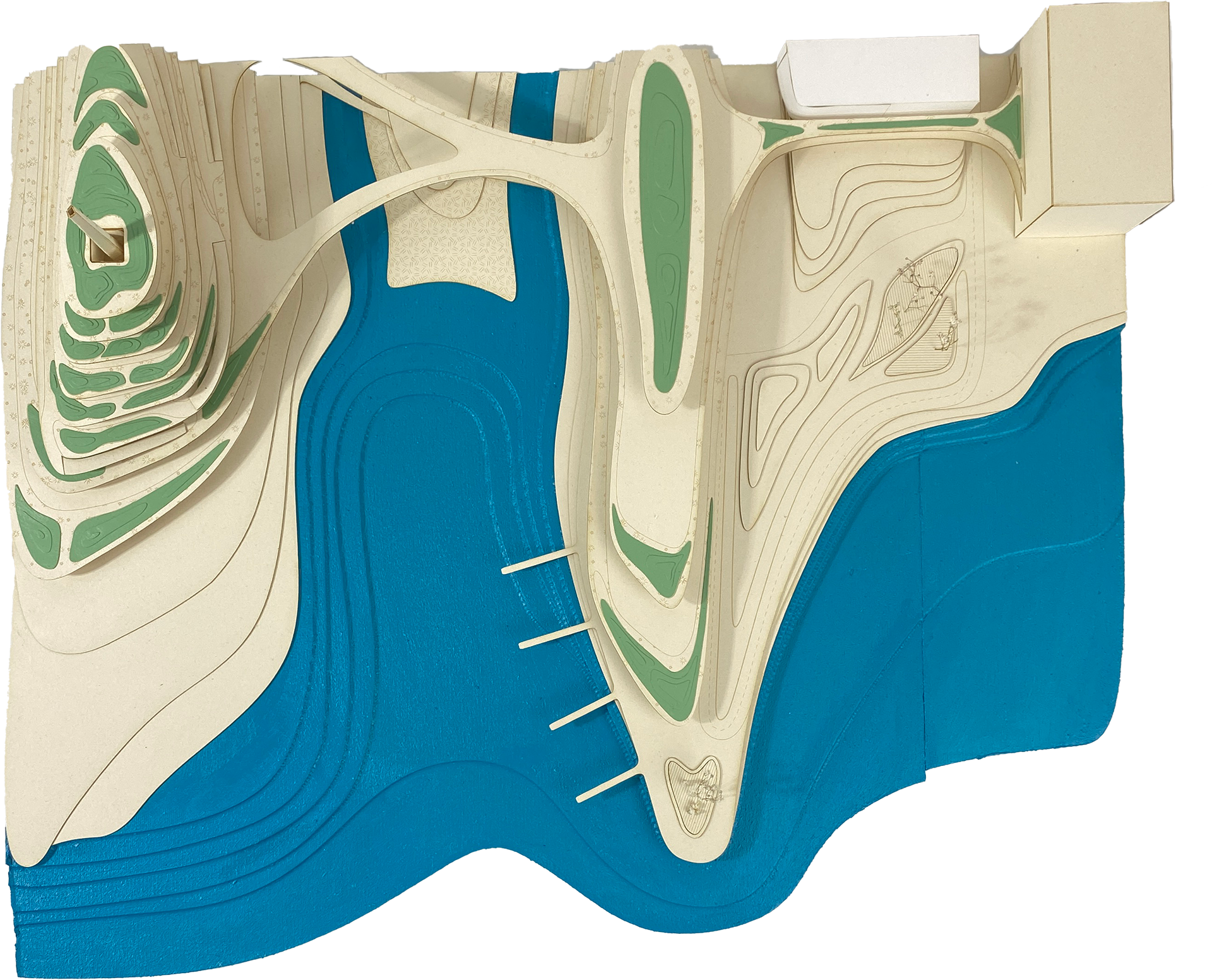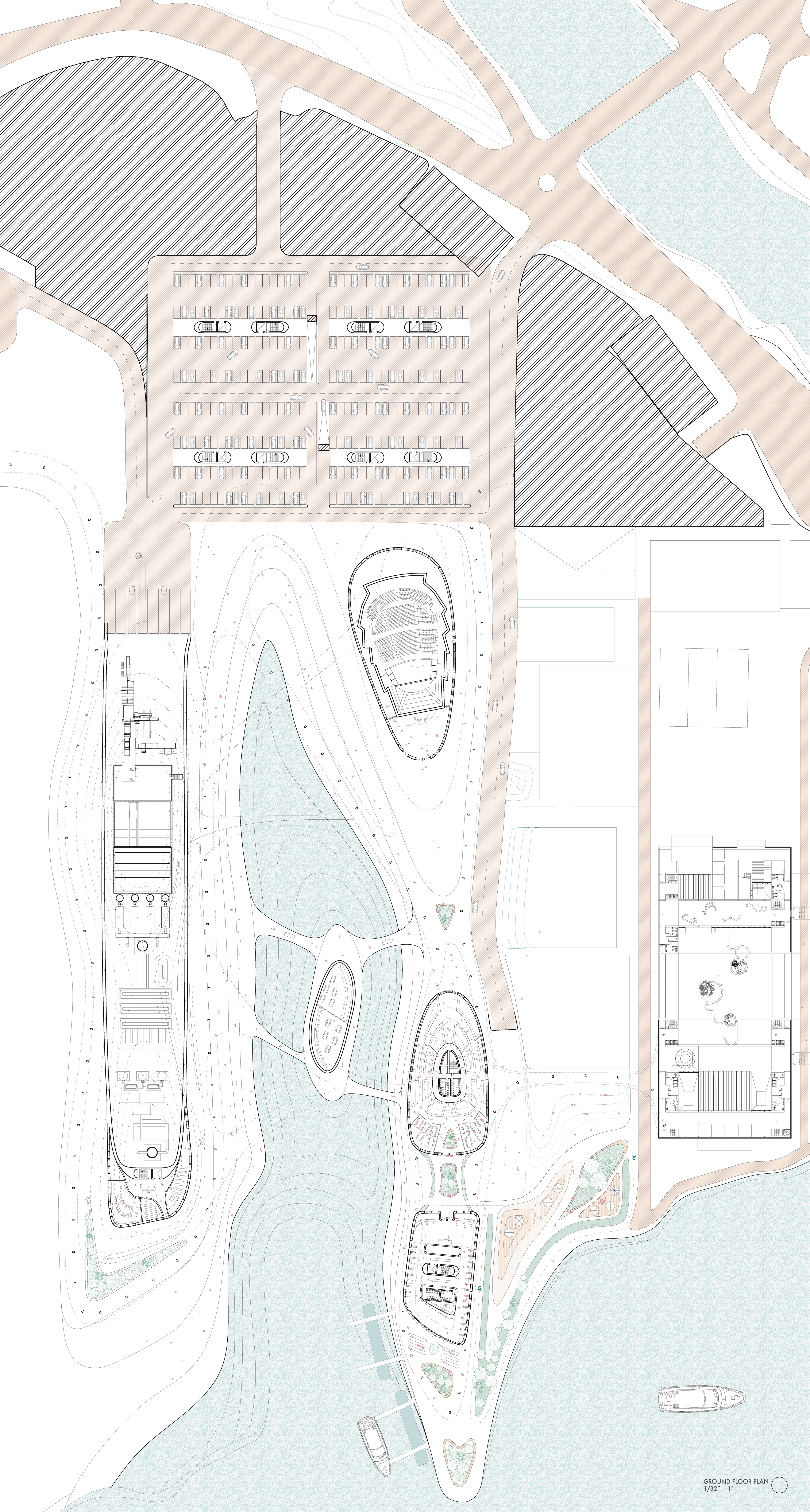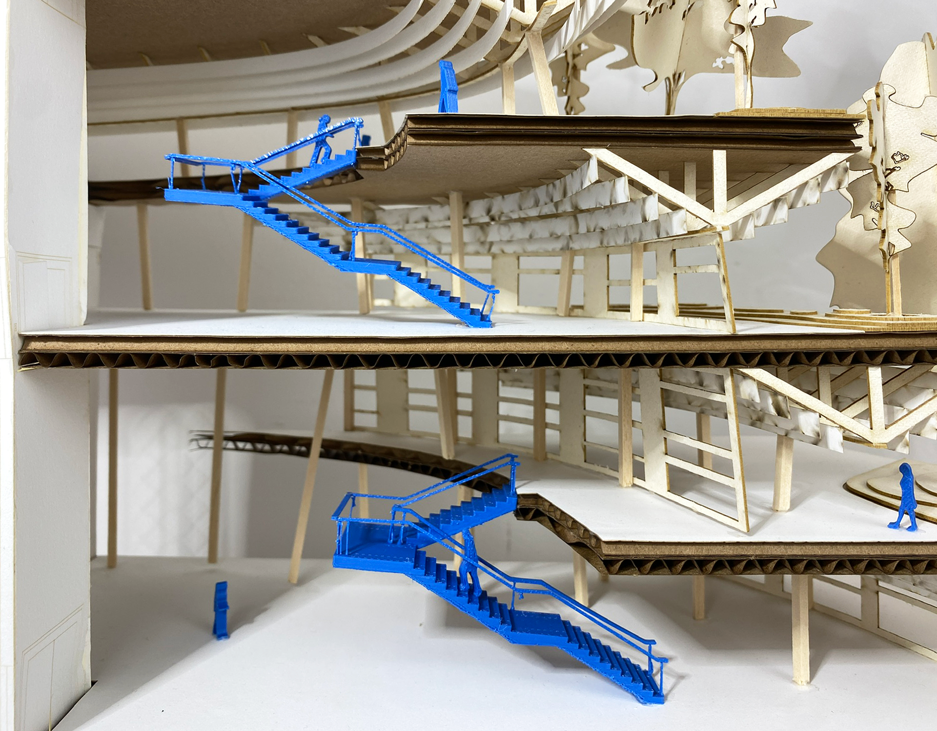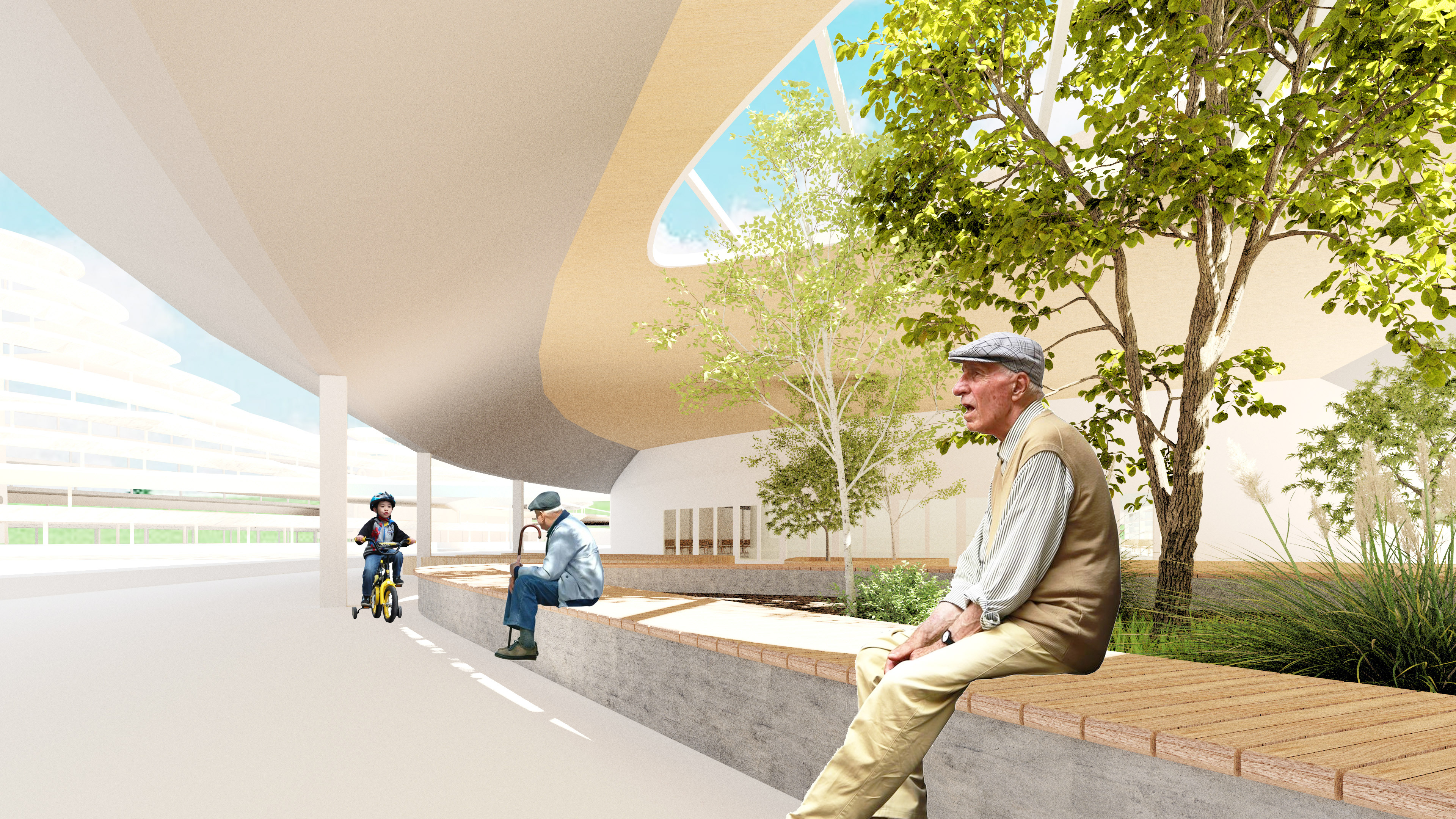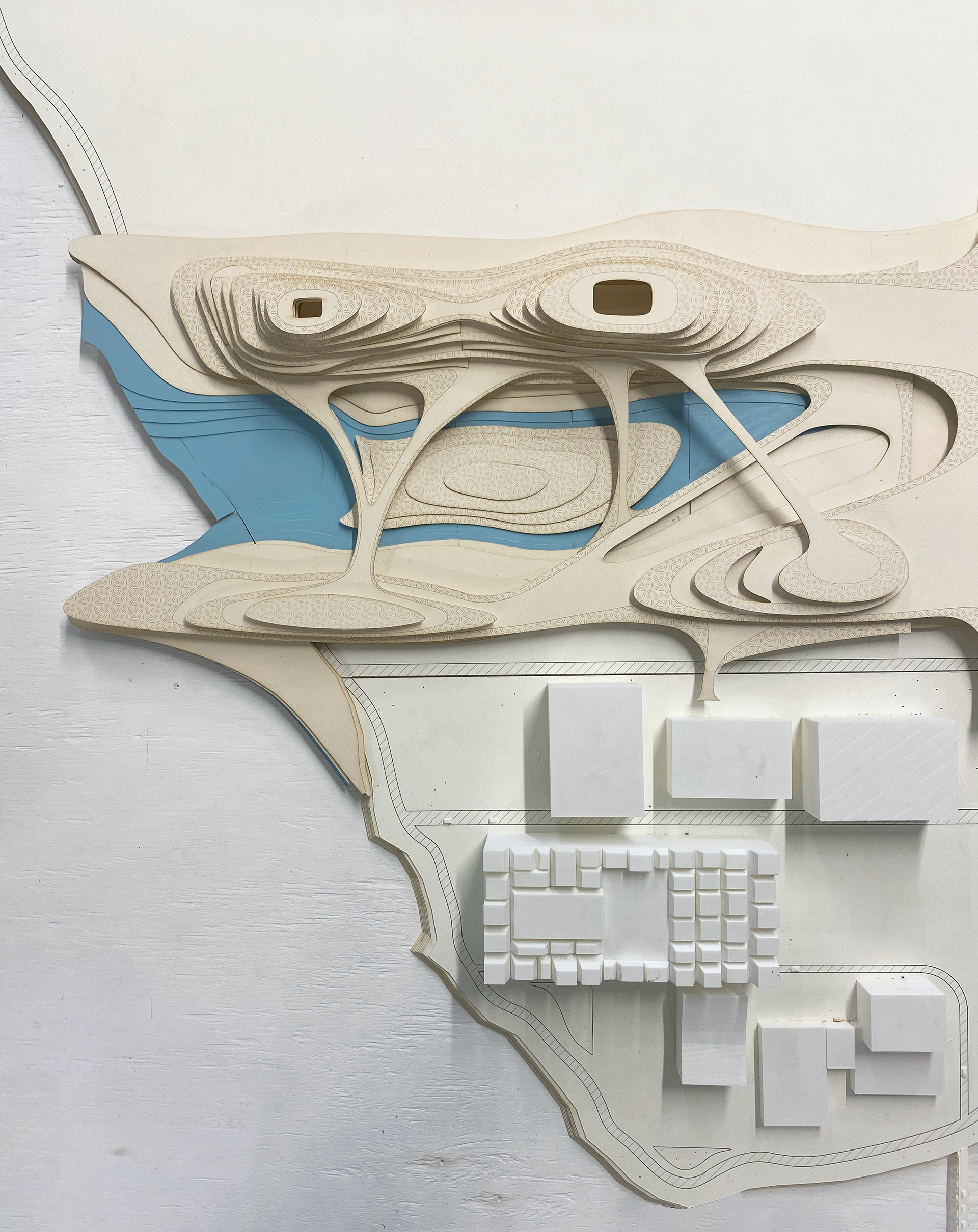 The waste to energy plant provides clean energy to the city of Rosario. The surrounding park is created with topographical layers from a mountainous encompassing structure, with the deeper interior areas of the platforms transformed into learning and working centers with double height spaces.