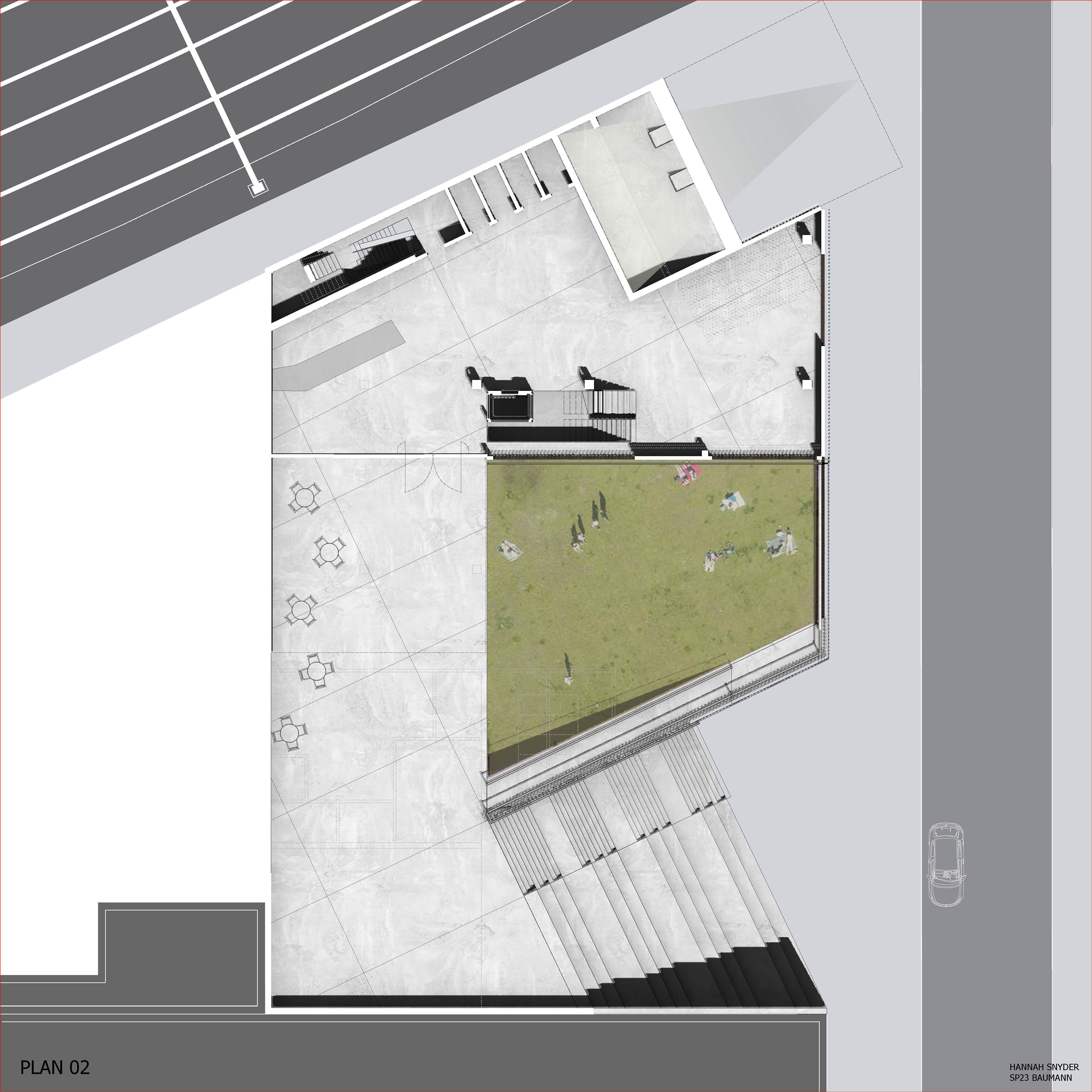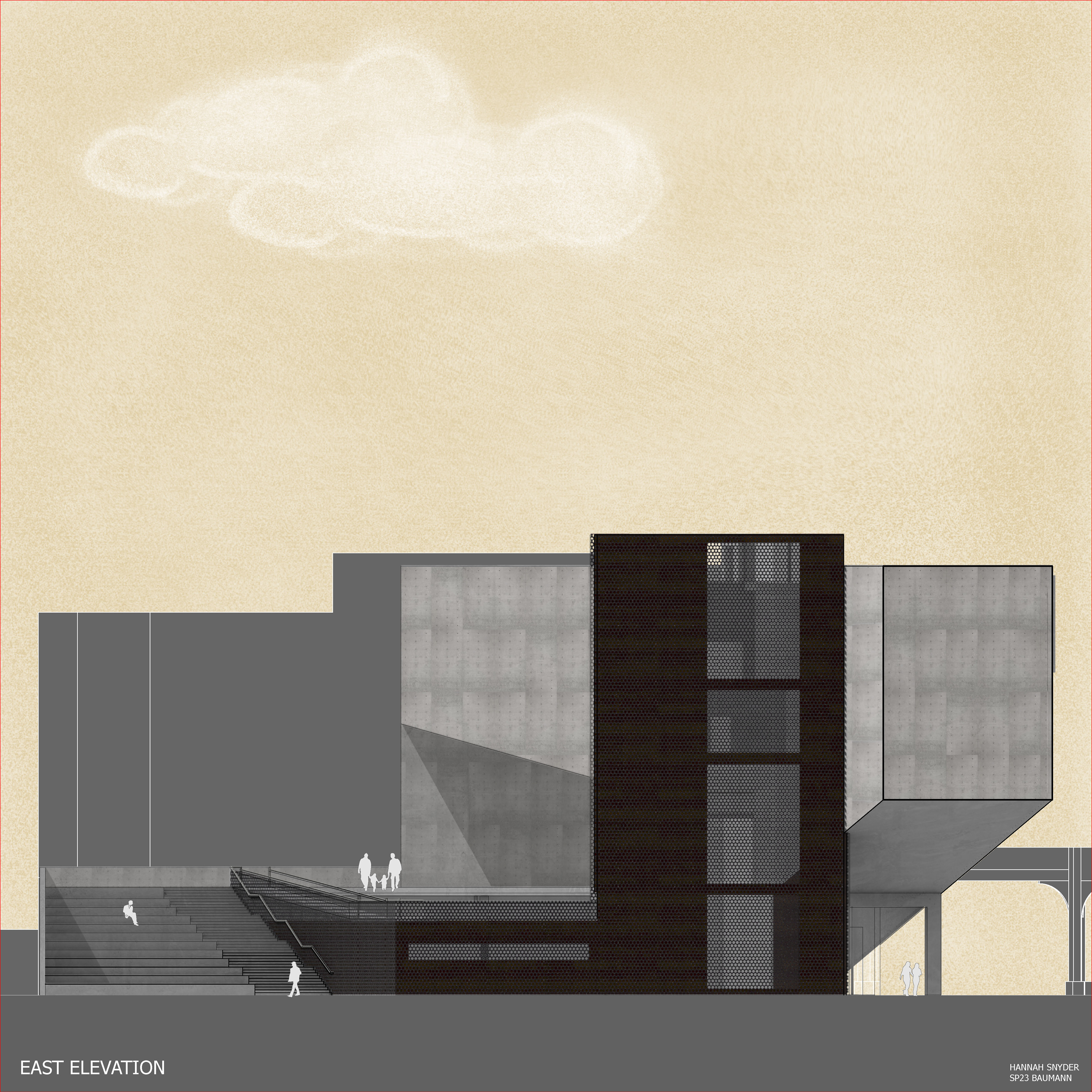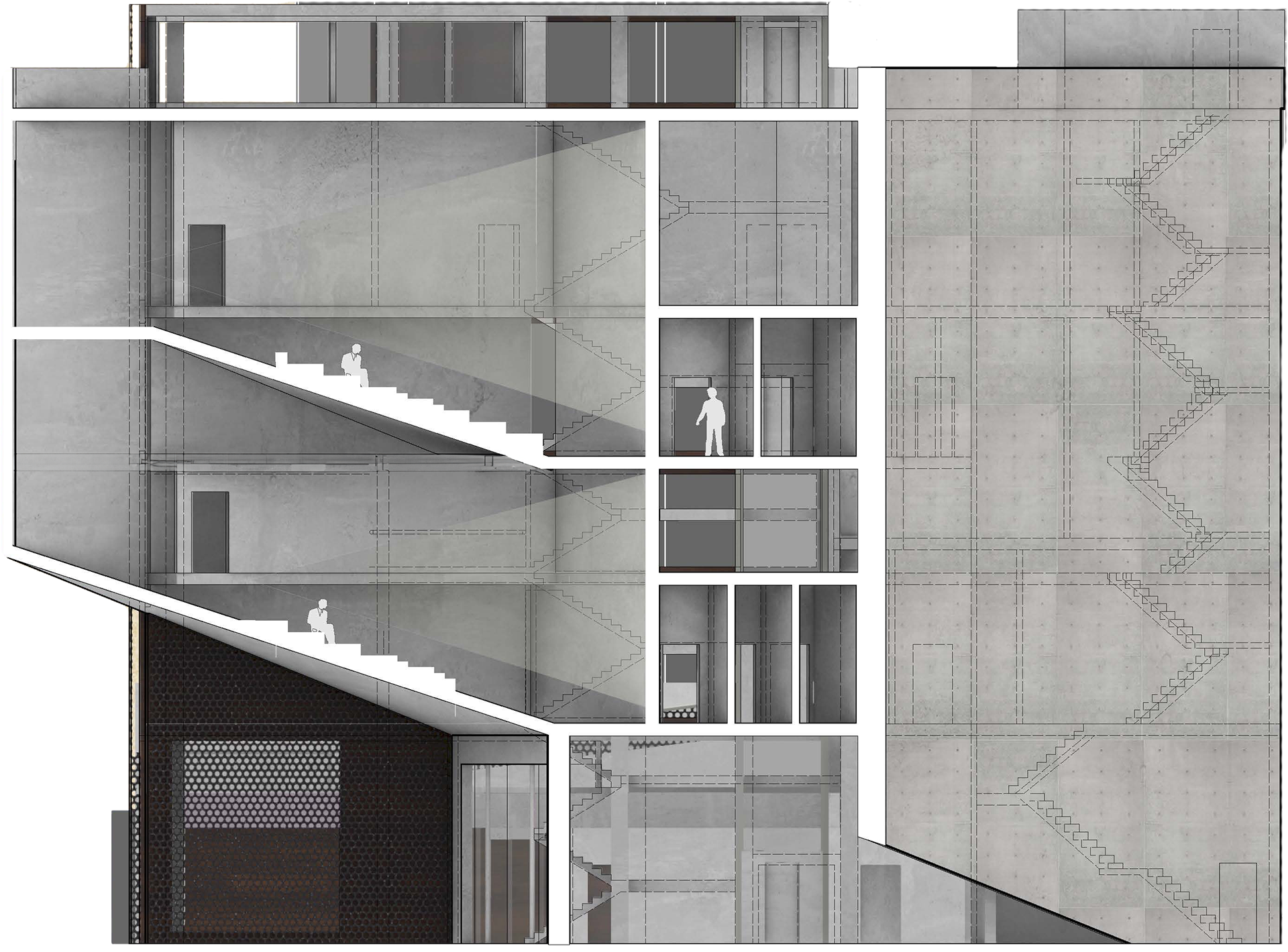 The theater addition is rendered visible in the sectional quality of the building, showcasing to passerby’s what lays within. The grand exterior stair further invites people to explore the nature of the theater spaces and the raised public garden area. The addition worked to include many new public spaces with the public park and exterior social stair to encompass the fundamental ideas of public use and access that is inherent in a library space.