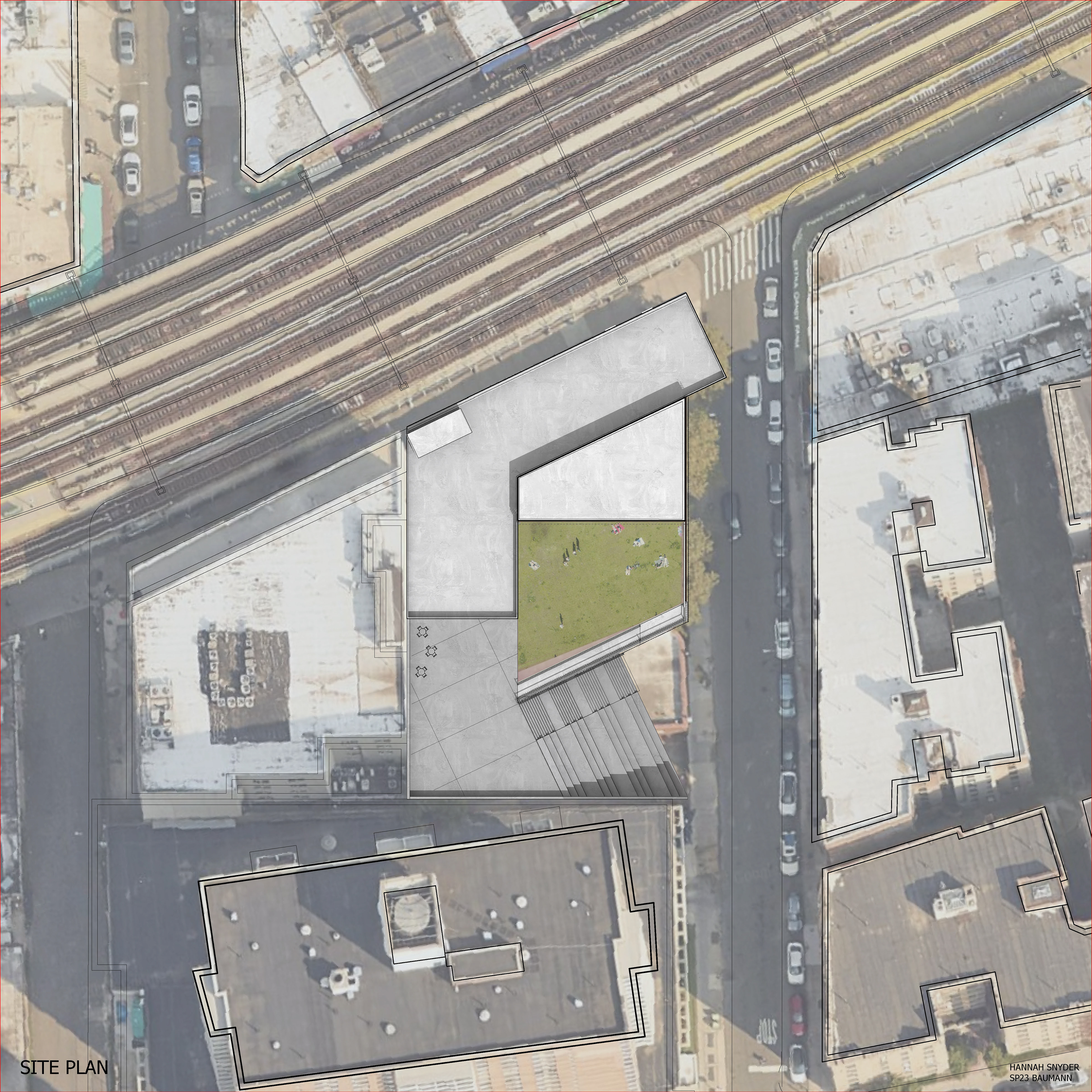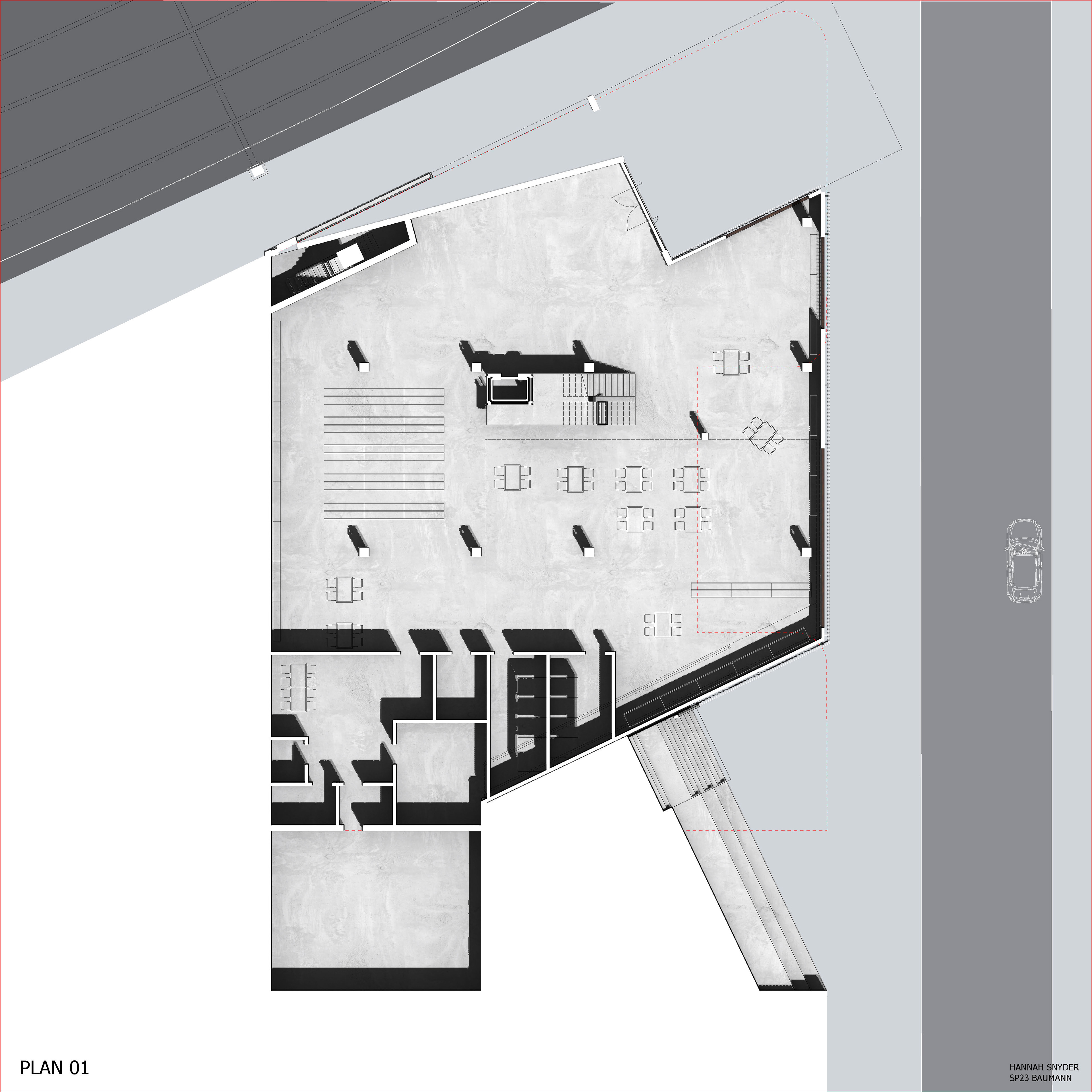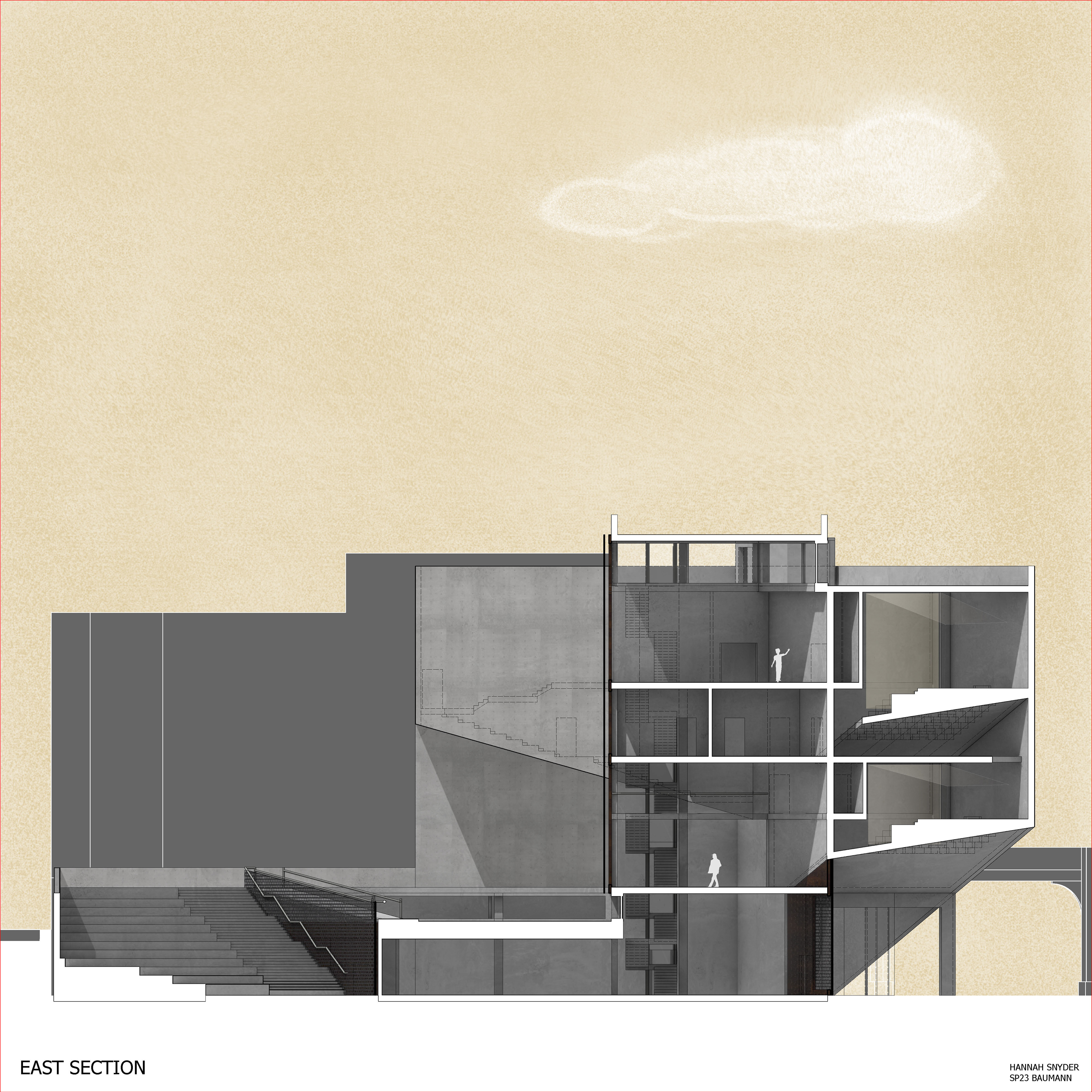 The theater addition is rendered visible in the sectional quality of the building, showcasing to passerby’s what lays within. The grand exterior stair further invites people to explore the nature of the theater spaces and the raised public garden area. The addition worked to include many new public spaces with the public park and exterior social stair to encompass the fundamental ideas of public use and access that is inherent in a library space.