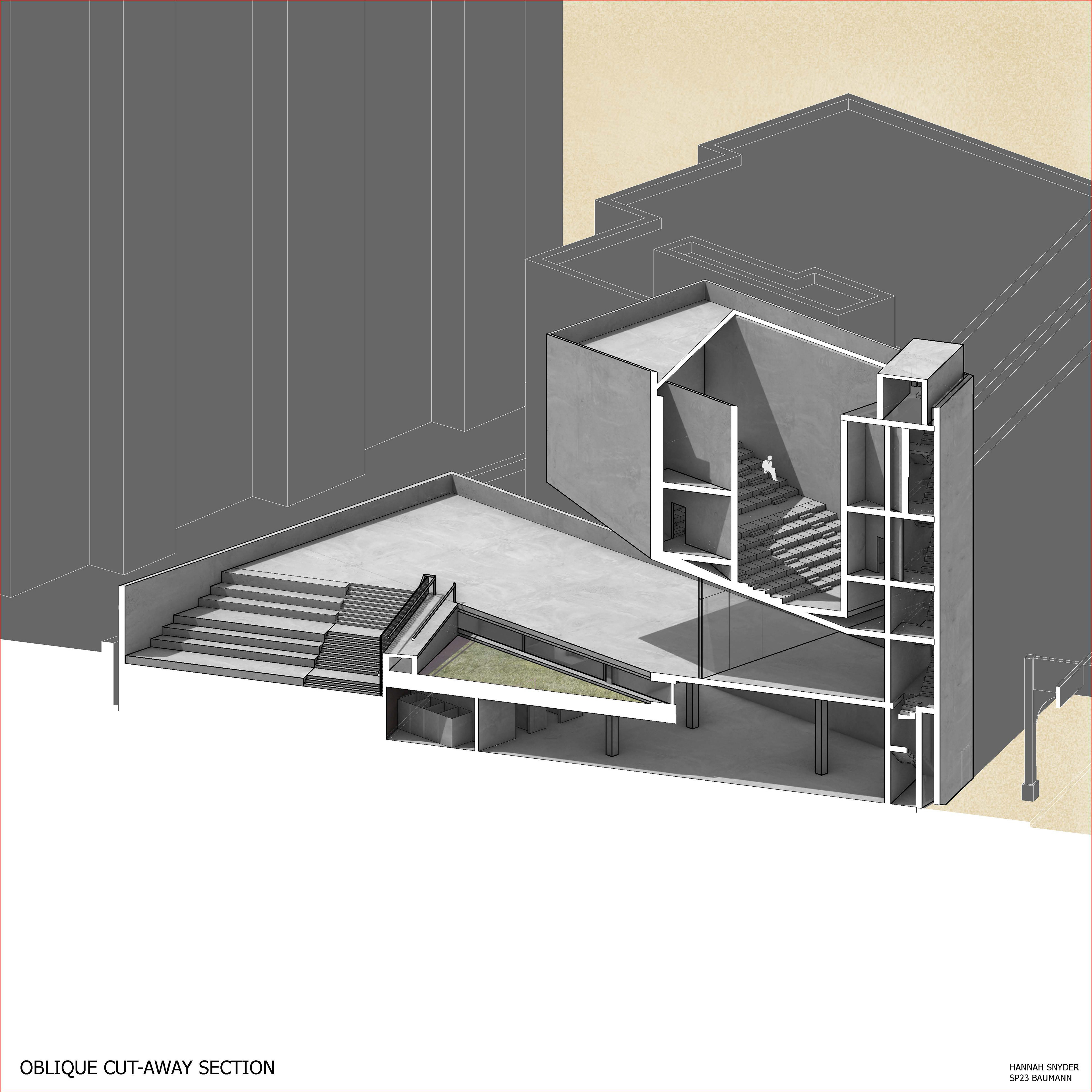 Angled facades bring visitors an exterior and interior experience of the theaters massing and volume.